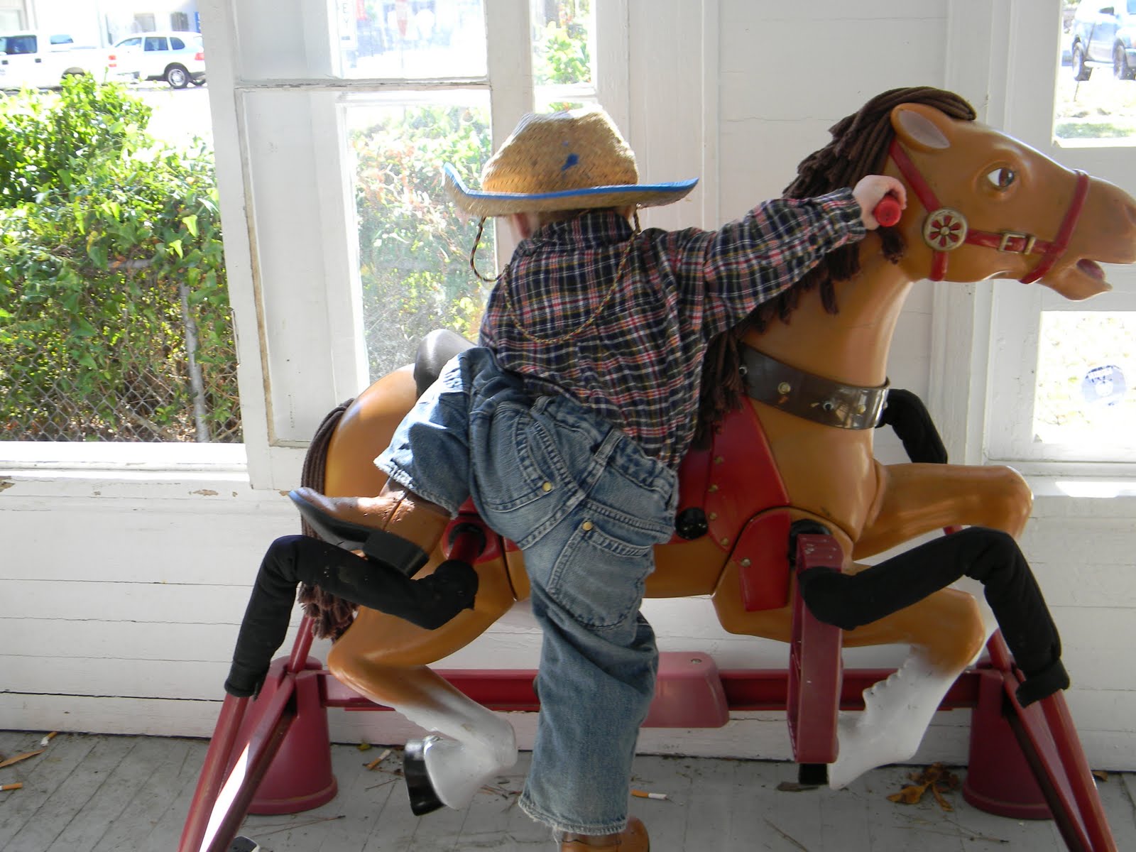 Almost ready to go, but Sam had to get in one more ride on the wonderhorse!